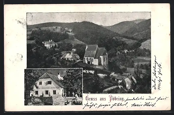 AK Pöbring, Gasthaus, Ortspartie mit Kirche