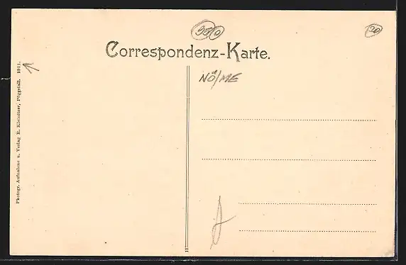 Personenbezogene Daten auf der Rückseite der Karte wurden durch blauen Textmarker unkenntlich gemacht. Die blauen Stellen sind auf die Vorderseite durchgeweicht und wirken sich negativ auf das Postkartenfoto aus