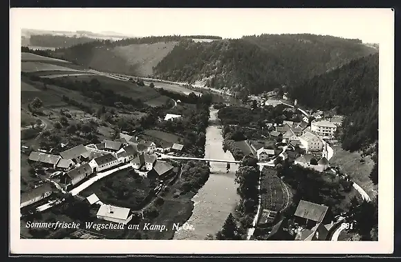 AK Pölla, Wegscheid am Kamp, Ortsansicht am Fluss aus der Vogelschau