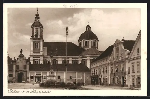 AK Pöllau, Hauptplatz mit Kirche und Denkmal