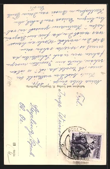 Personenbezogene Daten auf der Rückseite der Karte wurden durch blauen Textmarker unkenntlich gemacht. Die blauen Stellen sind auf die Vorderseite durchgeweicht und wirken sich negativ auf das Postkartenfoto aus