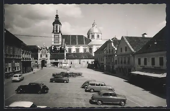 AK Pöllau /Ost-Stmk., Hauptplatz mit Kirche und Denkmal