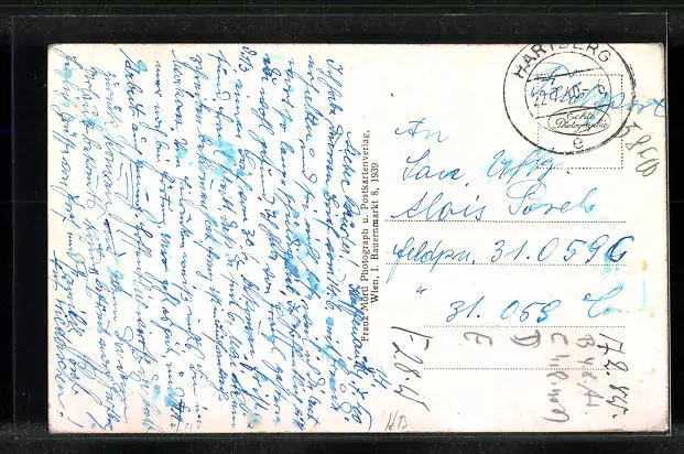Personenbezogene Daten auf der Rückseite der Karte wurden durch blauen Textmarker unkenntlich gemacht. Die blauen Stellen sind auf die Vorderseite durchgeweicht und wirken sich negativ auf das Postkartenfoto aus