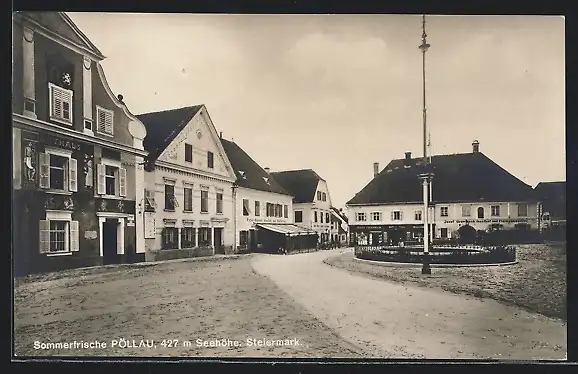 AK Pöllau, Strassenpartie mit Rathaus und Gasthof-Fleischhauerei