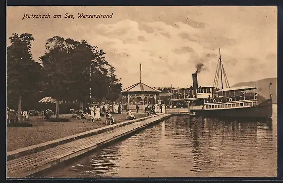AK Pörtschach am See, Werzerstrand mit Dampfer