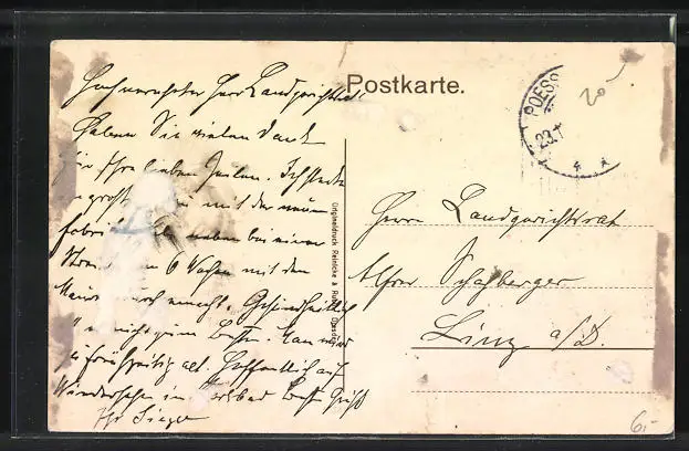 Personenbezogene Daten auf der Rückseite der Karte wurden durch blauen Textmarker unkenntlich gemacht. Die blauen Stellen sind auf die Vorderseite durchgeweicht und wirken sich negativ auf das Postkartenfoto aus