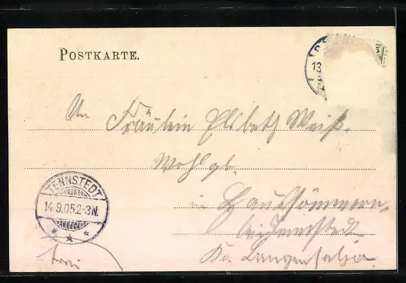 alte Ansichtskarte, gelaufen 1905, Briefmarke entfernt, rückseitig Oberflächenschaden, guter Zustand