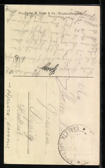 Personenbezogene Daten auf der Rückseite der Karte wurden durch blauen Textmarker unkenntlich gemacht. Die blauen Stellen sind auf die Vorderseite durchgeweicht und wirken sich negativ auf das Postkartenfoto aus