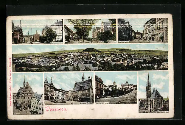 AK Pössneck, Totalansicht, Partie in der Bahnhofstrasse, Markt und Rathaus