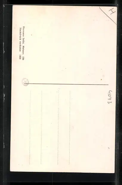 Personenbezogene Daten auf der Rückseite der Karte wurden durch blauen Textmarker unkenntlich gemacht. Die blauen Stellen sind auf die Vorderseite durchgeweicht und wirken sich negativ auf das Postkartenfoto aus
