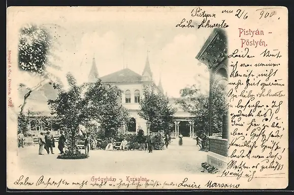 AK Pöstyén, Kursalon mit grüner Anlage und Besuchern
