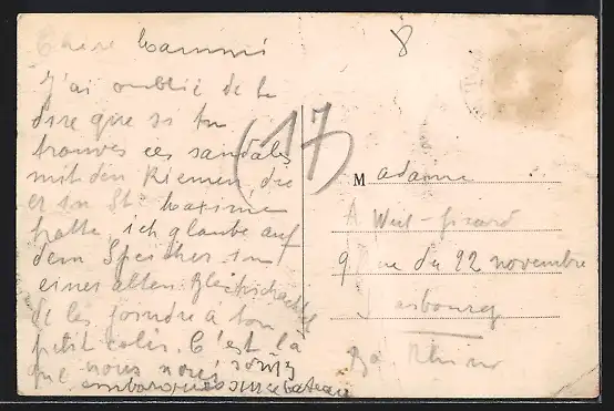 Personenbezogene Daten auf der Rückseite der Karte wurden durch blauen Textmarker unkenntlich gemacht. Die blauen Stellen sind auf die Vorderseite durchgeweicht und wirken sich negativ auf das Postkartenfoto aus