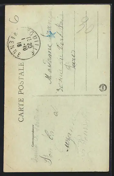 Personenbezogene Daten auf der Rückseite der Karte wurden durch blauen Textmarker unkenntlich gemacht. Die blauen Stellen sind auf die Vorderseite durchgeweicht und wirken sich negativ auf das Postkartenfoto aus