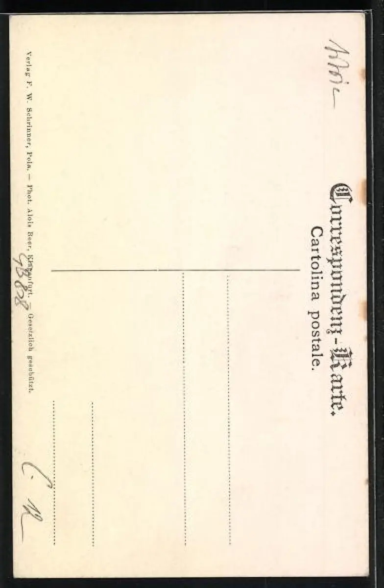 Personenbezogene Daten auf der Rückseite der Karte wurden durch blauen Textmarker unkenntlich gemacht. Die blauen Stellen sind auf die Vorderseite durchgeweicht und wirken sich negativ auf das Postkartenfoto aus