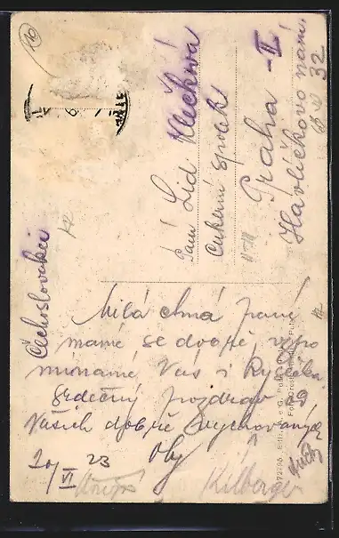 Personenbezogene Daten auf der Rückseite der Karte wurden durch blauen Textmarker unkenntlich gemacht. Die blauen Stellen sind auf die Vorderseite durchgeweicht und wirken sich negativ auf das Postkartenfoto aus