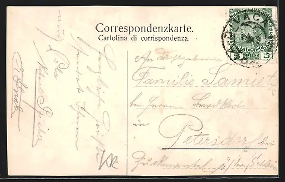 Personenbezogene Daten auf der Rückseite der Karte wurden durch blauen Textmarker unkenntlich gemacht. Die blauen Stellen sind auf die Vorderseite durchgeweicht und wirken sich negativ auf das Postkartenfoto aus