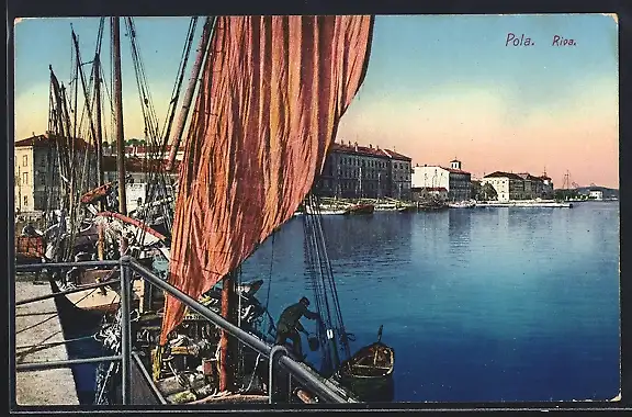 AK Pola, Riva, Partie am Hafen mit Segelschiffen