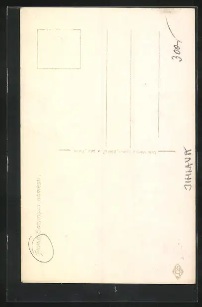 Personenbezogene Daten auf der Rückseite der Karte wurden durch blauen Textmarker unkenntlich gemacht. Die blauen Stellen sind auf die Vorderseite durchgeweicht und wirken sich negativ auf das Postkartenfoto aus