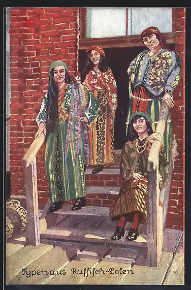 AK Polnische Frauen in Tracht an einem Hauseingang