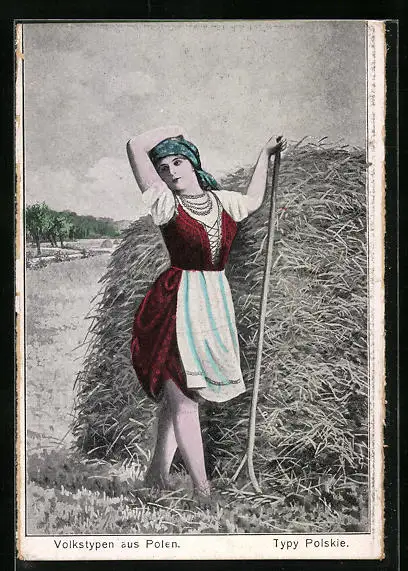 AK Polnische junge Bäuerin mit Rechen in Tracht