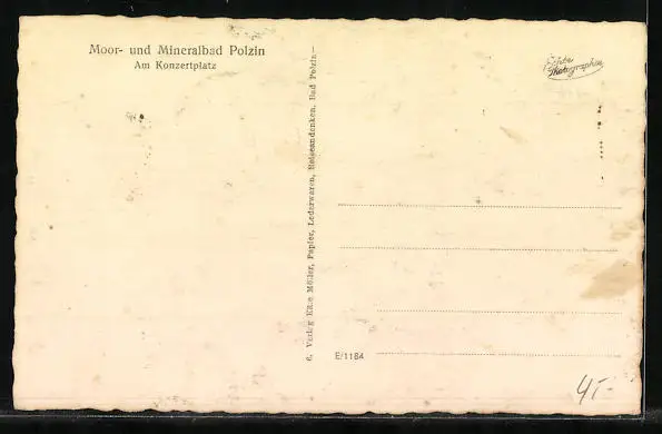 Personenbezogene Daten auf der Rückseite der Karte wurden durch blauen Textmarker unkenntlich gemacht. Die blauen Stellen sind auf die Vorderseite durchgeweicht und wirken sich negativ auf das Postkartenfoto aus
