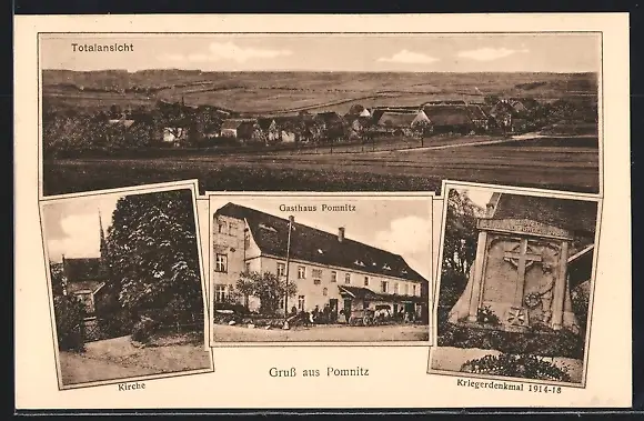AK Pomnitz, Gasthaus Pomnitz, Kirche, Kriegerdenkmal 1914-18
