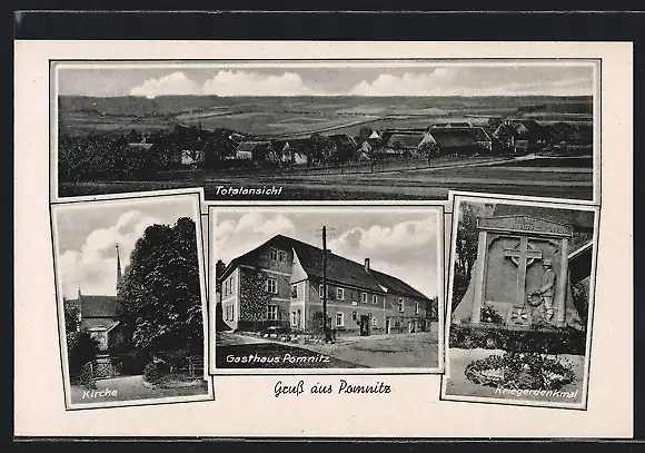 AK Pomnitz, Gasthaus, Totalansicht, Kirche