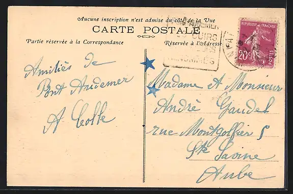 Personenbezogene Daten auf der Rückseite der Karte wurden durch blauen Textmarker unkenntlich gemacht. Die blauen Stellen sind auf die Vorderseite durchgeweicht und wirken sich negativ auf das Postkartenfoto aus