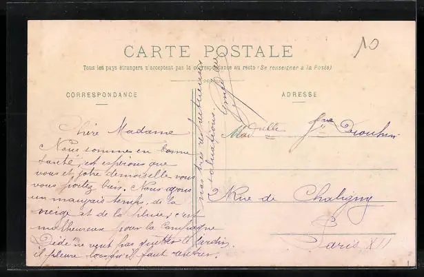 Personenbezogene Daten auf der Rückseite der Karte wurden durch blauen Textmarker unkenntlich gemacht. Die blauen Stellen sind auf die Vorderseite durchgeweicht und wirken sich negativ auf das Postkartenfoto aus