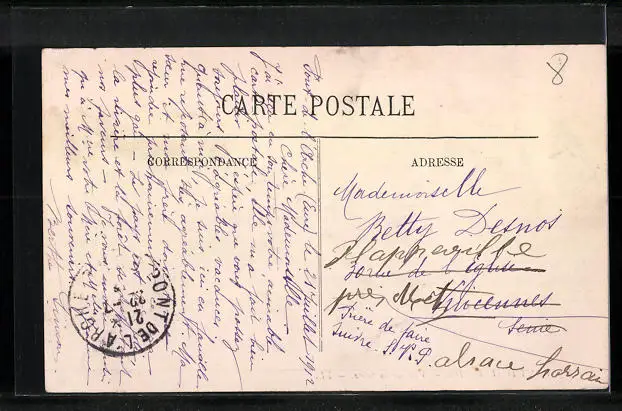 Personenbezogene Daten auf der Rückseite der Karte wurden durch blauen Textmarker unkenntlich gemacht. Die blauen Stellen sind auf die Vorderseite durchgeweicht und wirken sich negativ auf das Postkartenfoto aus