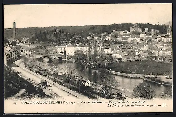 AK Pontgibaud, Vue générale et route du Circuit Michelin sur le pont
