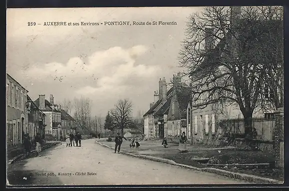 AK Pontigny, Route de St Florentin avec passants et bâtiments historiques