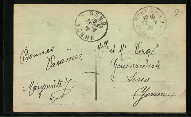 Personenbezogene Daten auf der Rückseite der Karte wurden durch blauen Textmarker unkenntlich gemacht. Die blauen Stellen sind auf die Vorderseite durchgeweicht und wirken sich negativ auf das Postkartenfoto aus