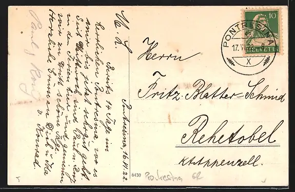 Personenbezogene Daten auf der Rückseite der Karte wurden durch blauen Textmarker unkenntlich gemacht. Die blauen Stellen sind auf die Vorderseite durchgeweicht und wirken sich negativ auf das Postkartenfoto aus