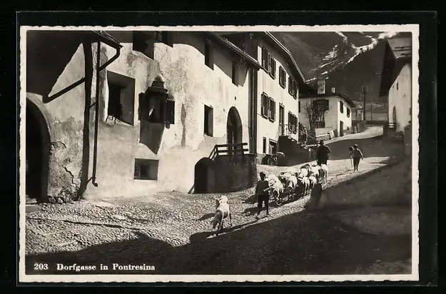 AK Pontresina, Hirte mit Schafsherde in der Dorfgasse