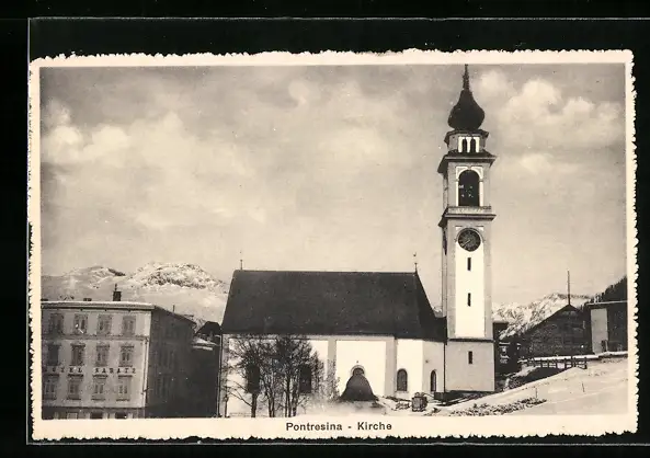 AK Pontresina, Kirche und Hotel Sabatz im Winter