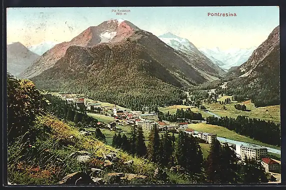 AK Pontresina, Totalansicht mit Piz Rosatsch