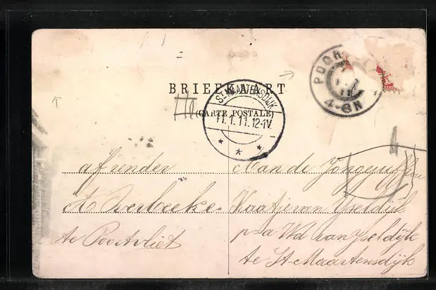 gelaufen 1911, Briefmarke tw. entfernt, rückseitig Oberflächenschaden, Eckknick li. oben u. re. unten, minimale Einriss oben li. u. mittig, Stempelspur