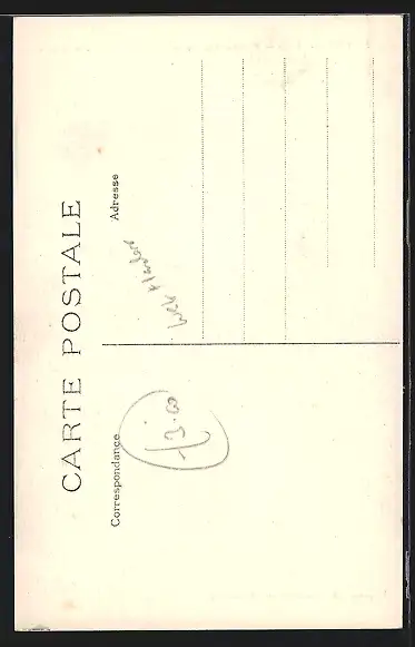 Personenbezogene Daten auf der Rückseite der Karte wurden durch blauen Textmarker unkenntlich gemacht. Die blauen Stellen sind auf die Vorderseite durchgeweicht und wirken sich negativ auf das Postkartenfoto aus