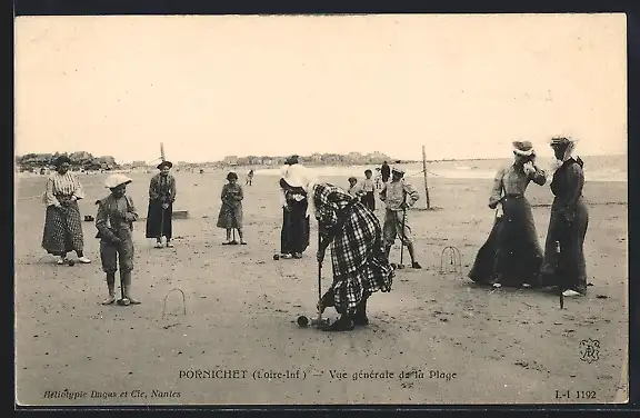 AK Pornichet, Vue générale de la plage avec des personnes jouant au croquet