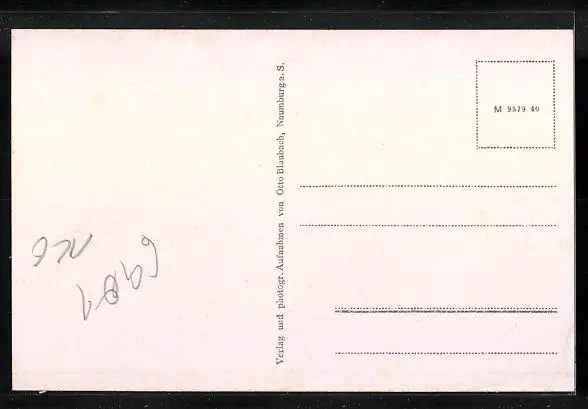 Personenbezogene Daten auf der Rückseite der Karte wurden durch blauen Textmarker unkenntlich gemacht. Die blauen Stellen sind auf die Vorderseite durchgeweicht und wirken sich negativ auf das Postkartenfoto aus