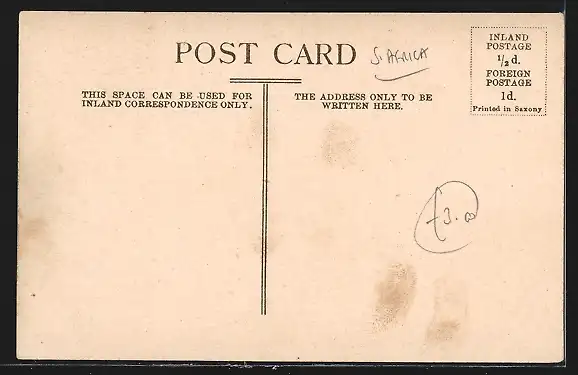 Personenbezogene Daten auf der Rückseite der Karte wurden durch blauen Textmarker unkenntlich gemacht. Die blauen Stellen sind auf die Vorderseite durchgeweicht und wirken sich negativ auf das Postkartenfoto aus