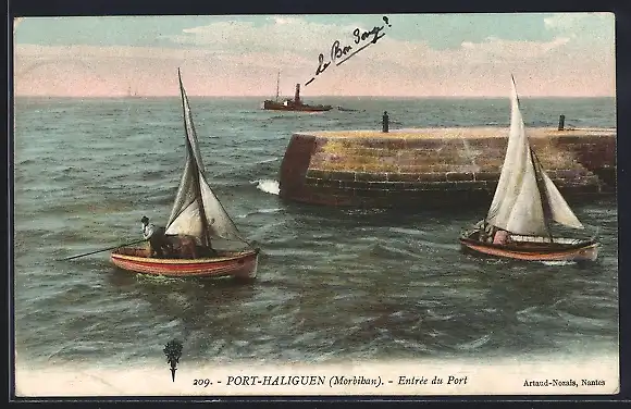AK Port-Haliguen, Entrée du port avec voiliers et brise-lames