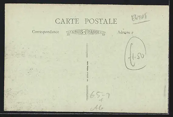 Personenbezogene Daten auf der Rückseite der Karte wurden durch blauen Textmarker unkenntlich gemacht. Die blauen Stellen sind auf die Vorderseite durchgeweicht und wirken sich negativ auf das Postkartenfoto aus