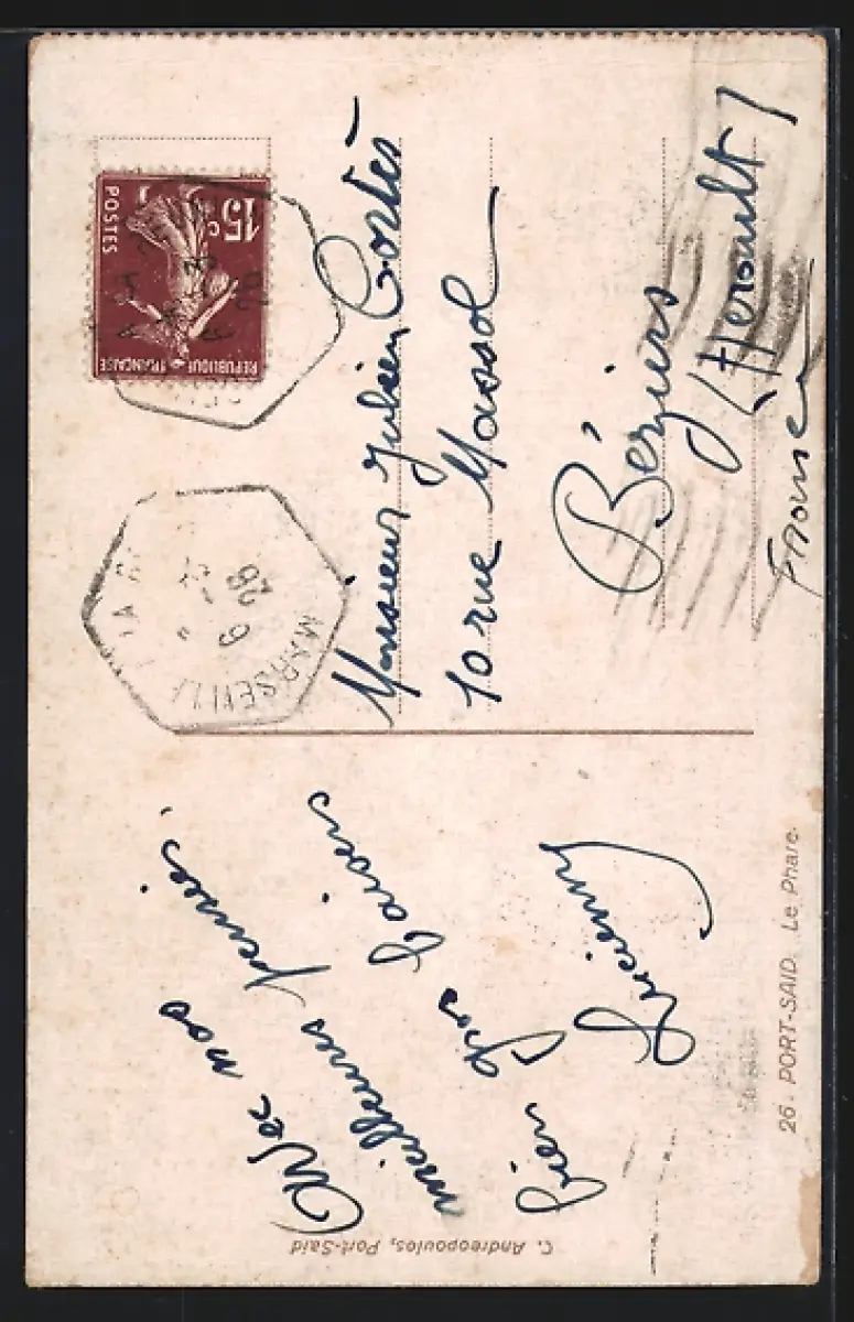 Personenbezogene Daten auf der Rückseite der Karte wurden durch blauen Textmarker unkenntlich gemacht. Die blauen Stellen sind auf die Vorderseite durchgeweicht und wirken sich negativ auf das Postkartenfoto aus