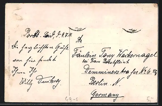 alte Ansichtskarte, gelaufen 1914, Briefmarke entfernt, rückseitig Oberflächenschaden, guter Zustand