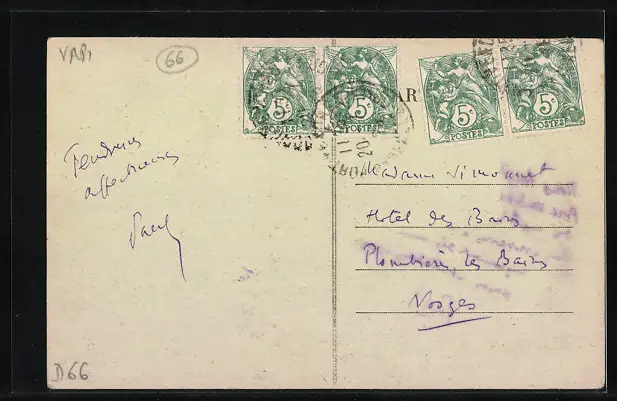 Personenbezogene Daten auf der Rückseite der Karte wurden durch blauen Textmarker unkenntlich gemacht. Die blauen Stellen sind auf die Vorderseite durchgeweicht und wirken sich negativ auf das Postkartenfoto aus
