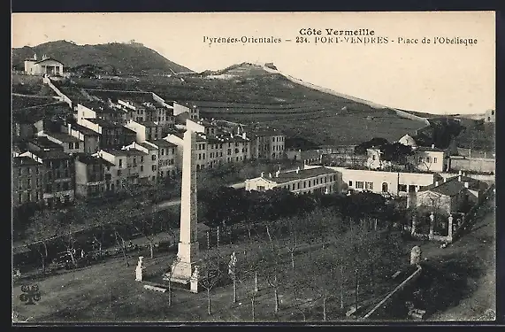 AK Port-Vendres, Place de l`Obélisque avec vue sur les collines et bâtiments environnants