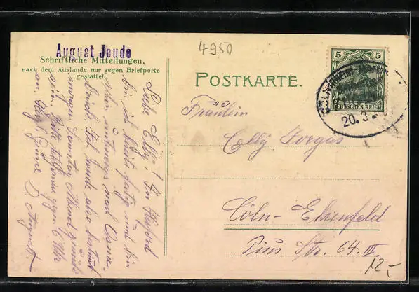 Personenbezogene Daten auf der Rückseite der Karte wurden durch blauen Textmarker unkenntlich gemacht. Die blauen Stellen sind auf die Vorderseite durchgeweicht und wirken sich negativ auf das Postkartenfoto aus