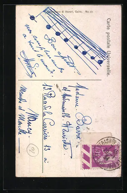Personenbezogene Daten auf der Rückseite der Karte wurden durch blauen Textmarker unkenntlich gemacht. Die blauen Stellen sind auf die Vorderseite durchgeweicht und wirken sich negativ auf das Postkartenfoto aus